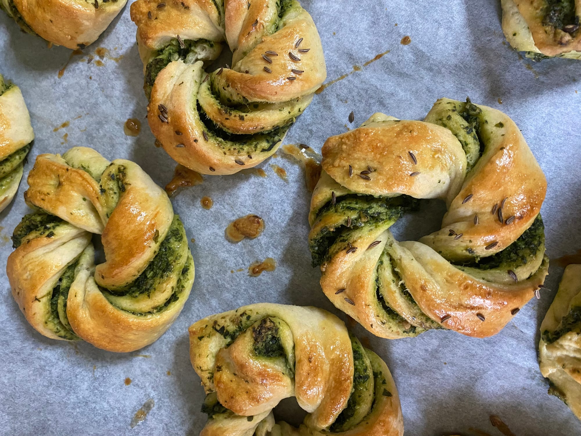 Po vykynutí těsto rozválejte, potřete pestem a zamotej uzly.