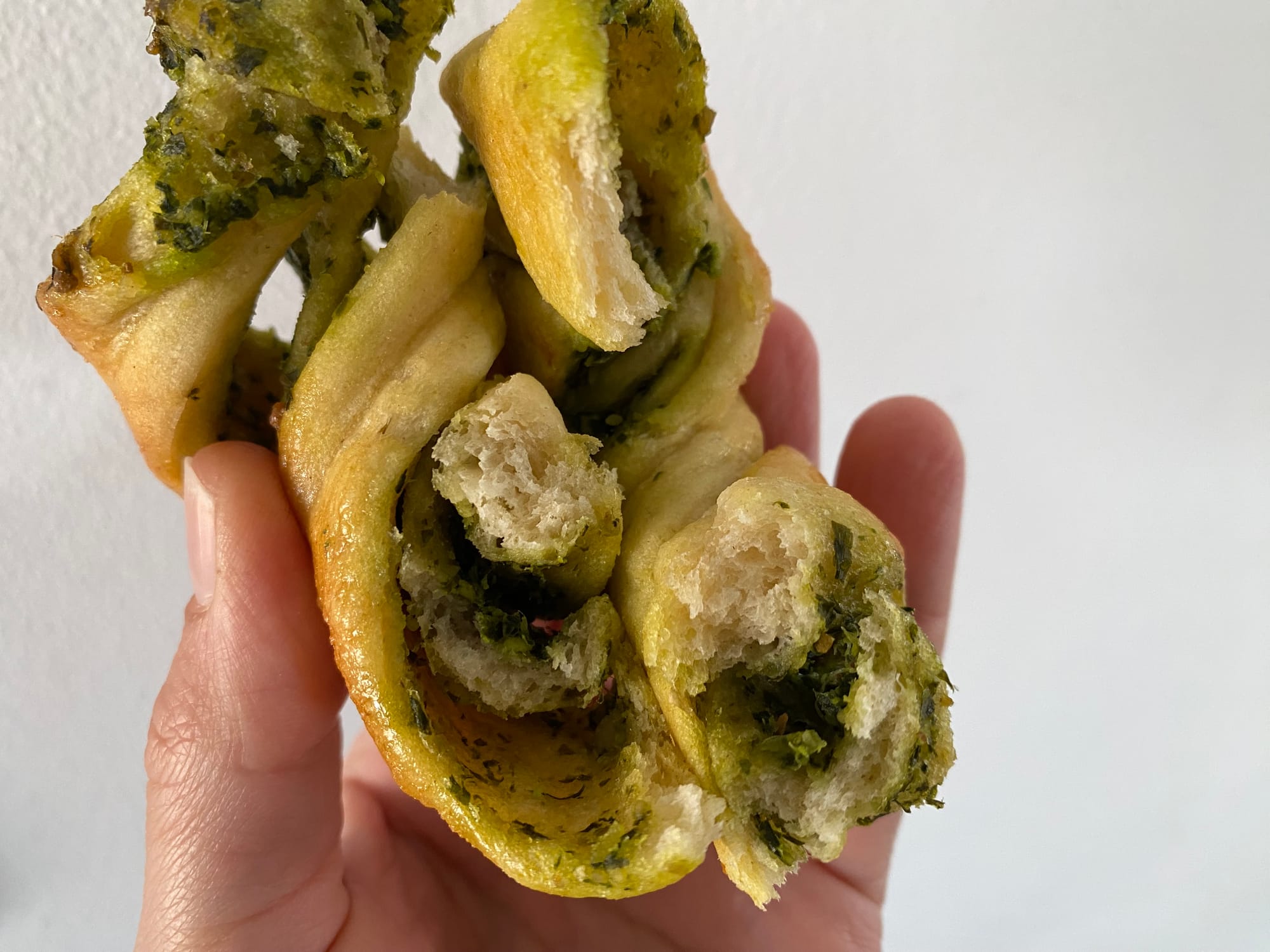 - Vezměte jeden proužek, jednou rukou ho držte na jednom konci a druhou ho několikrát zatočte jako spirálu. Pak kolem dvou prstů omotejte jednoduchý uzel a konce schovejte dospod, aby se při pečení nerozmotaly.