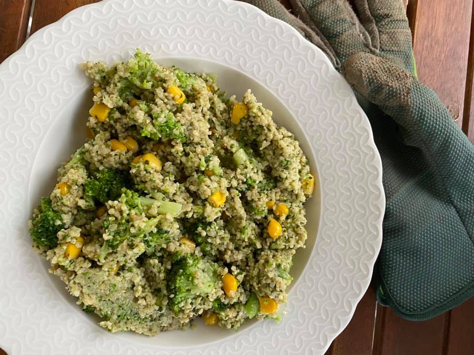 Hotovou zeleninu přidejte ke kuskusu. Zamíchejte zhruba 3 lžíce pesta, nebo zkrátka tolik, aby vám to chutnalo. A voilala, máte hotovo a můžete servírovat. Rychlovka k večeři, k obědu nebo třeba do krabičky ke svačině.