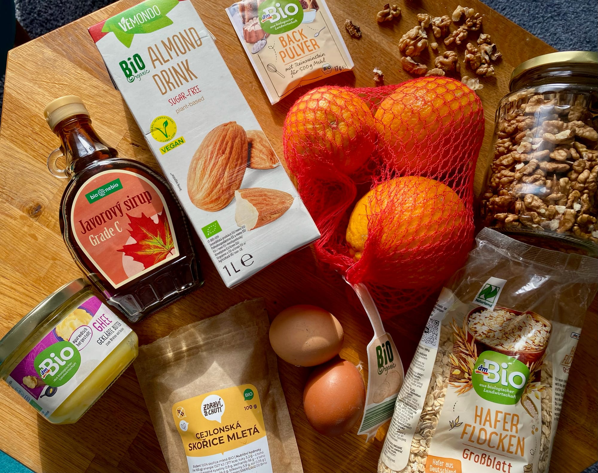 Základem jsou ovesné vločky, které jsou nabité betaglukany skvělé na imunitu a stabilní hladinu cukru v krvi. Texturu doplňuje mandlové mléko, svěžest a jarní barvu dodá vymačkaná pomerančová šťáva a křupnutí vlašské ořechy, které si děti v neděli samy vylouskaly.