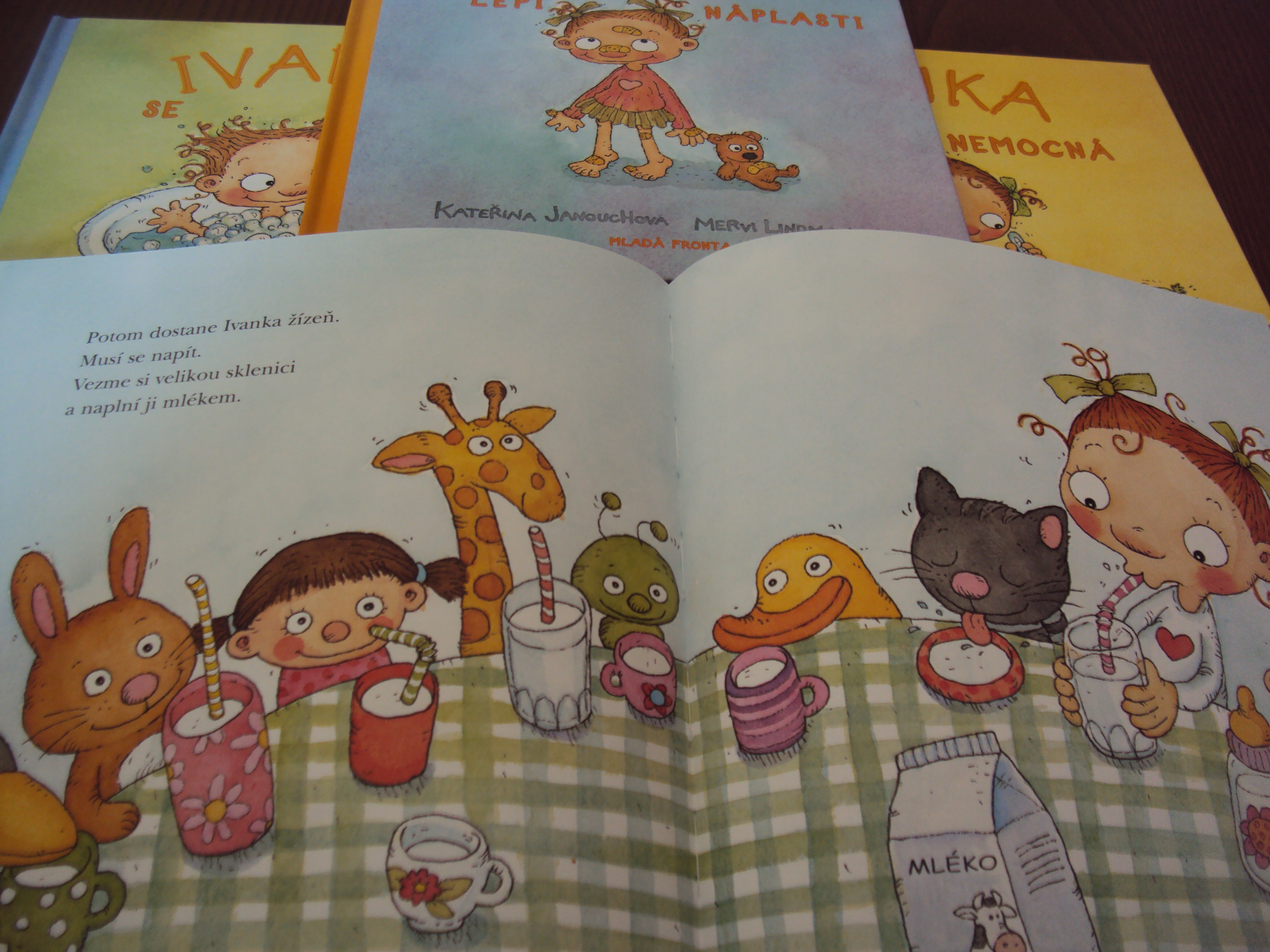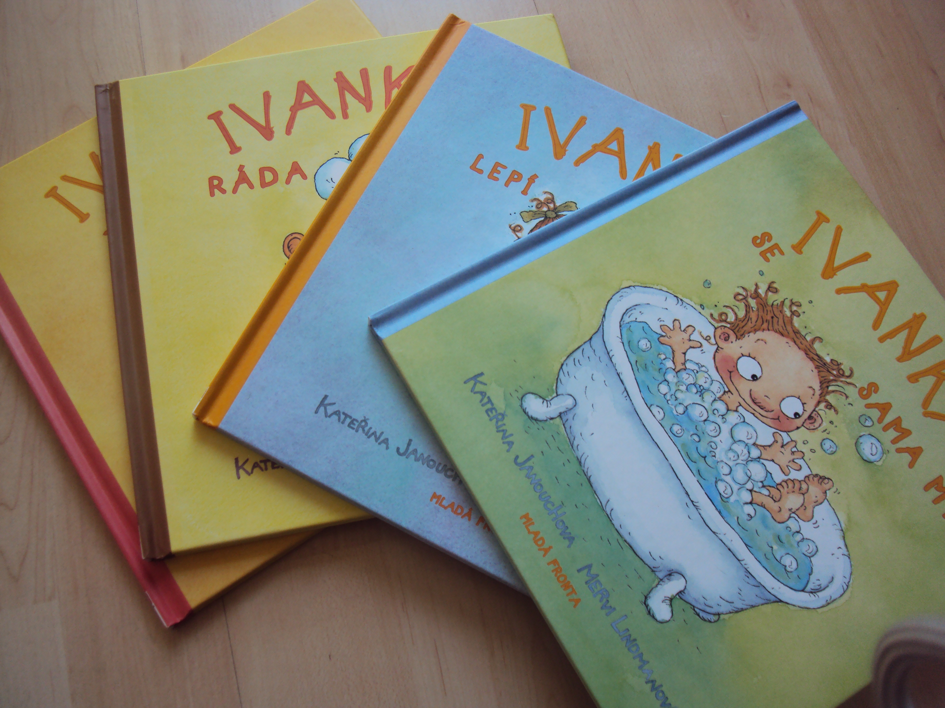 Na doporučení jsme pořídili domů sérii knih o Ivance od Kateřiny Janouchové. Ivanka se sama myje, Ivanka lepí náplasti, Ivanka je nemocná a Ivanka sama jí. A jsou skvělé! Teda mě ty texty až tak nenadchly, ale naše skoro dvouleťačka Ivanku miluje. Čteme knížky neustále dokola. Nejraději ze všech má knížku o lepení náplastí.