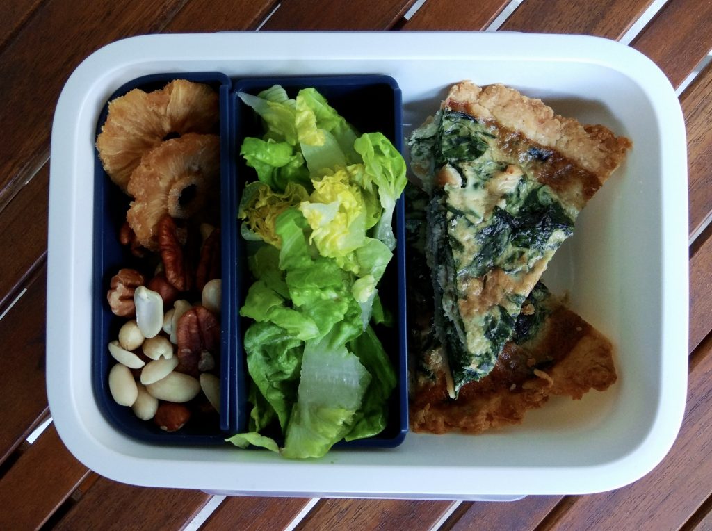 Do školy si Nel k tomu přála salát. Oblíbený ledový vyměnila tentokrát za římský. Krabičku jsme doplnili o energii v podobě směsi oříšků a sušeného nedoslazeného ananasu.